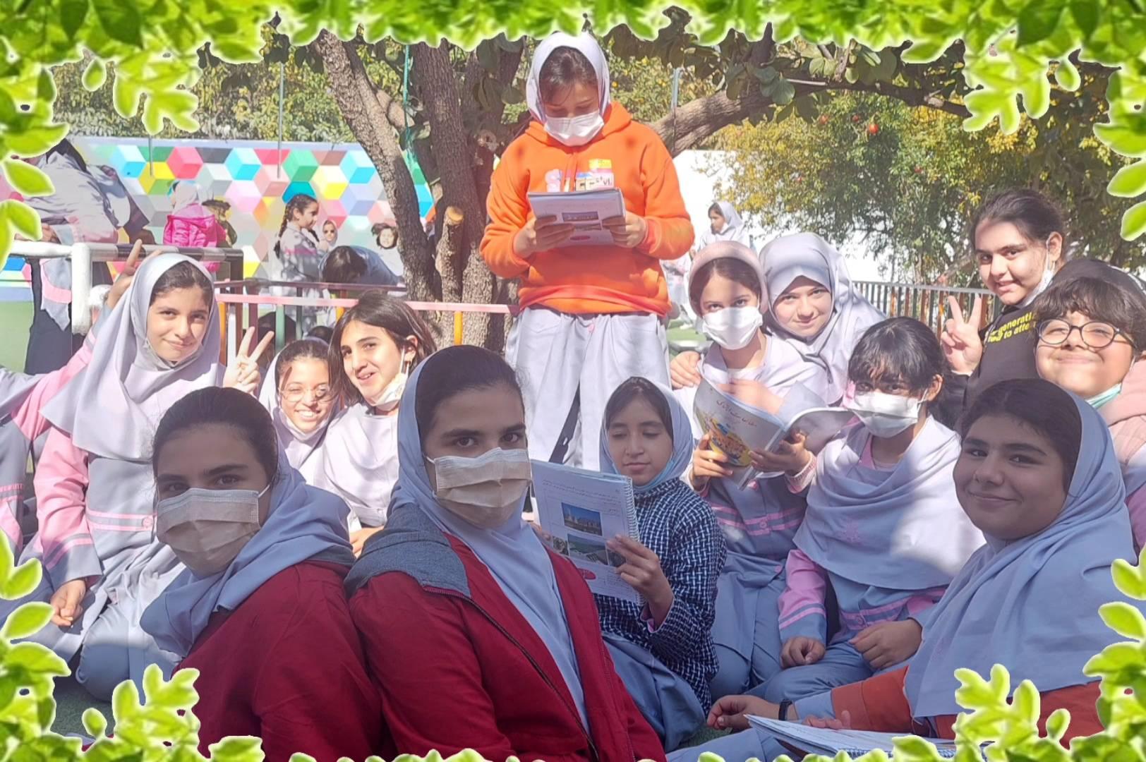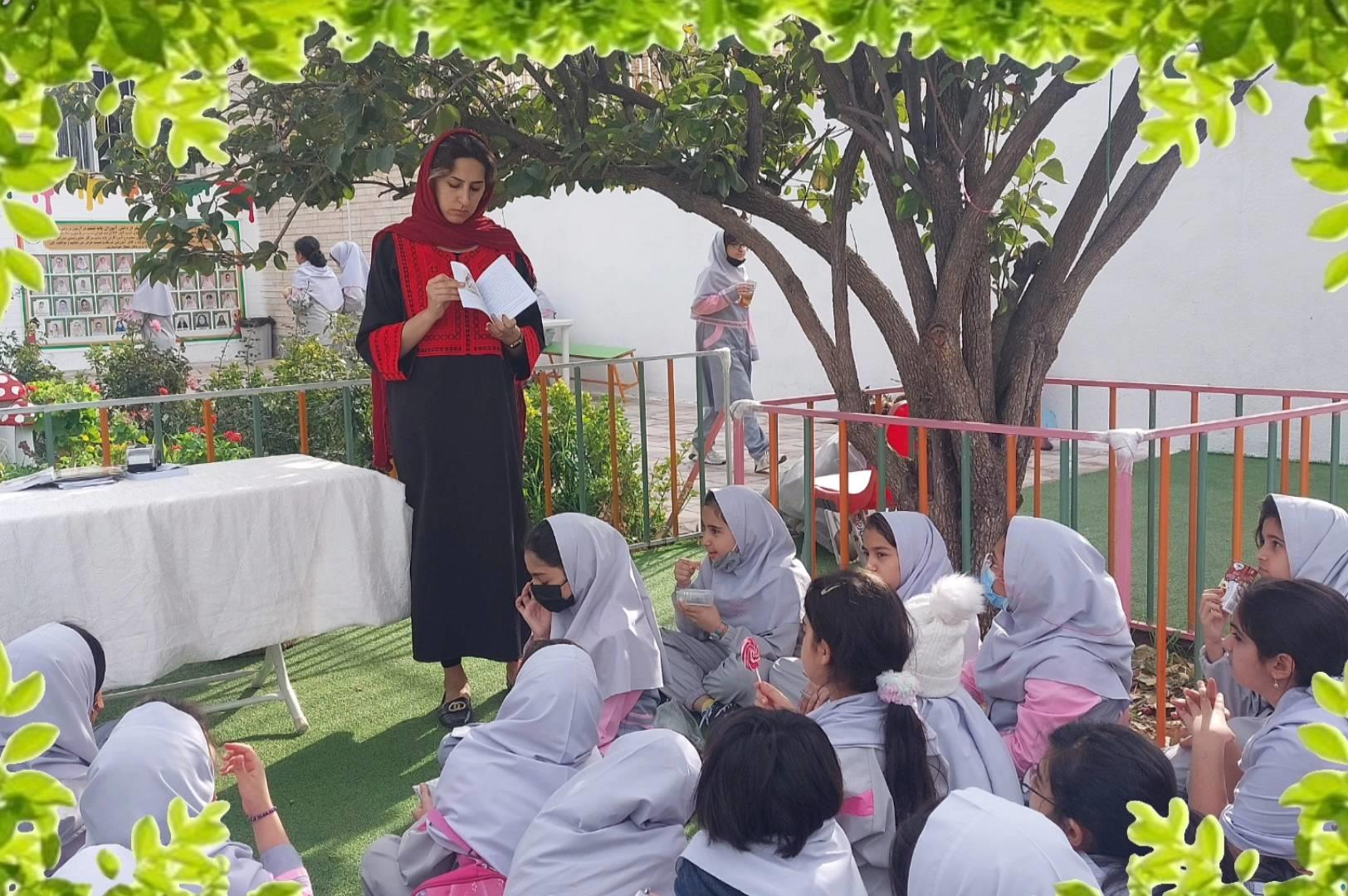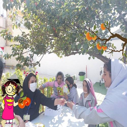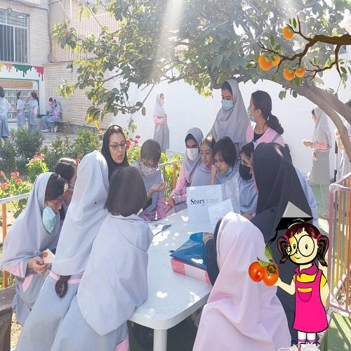 قصه گویی توسط کتابدار محترم فروشگاه کتاب لادن در زنگ تفریح زیر درخت خرمالو