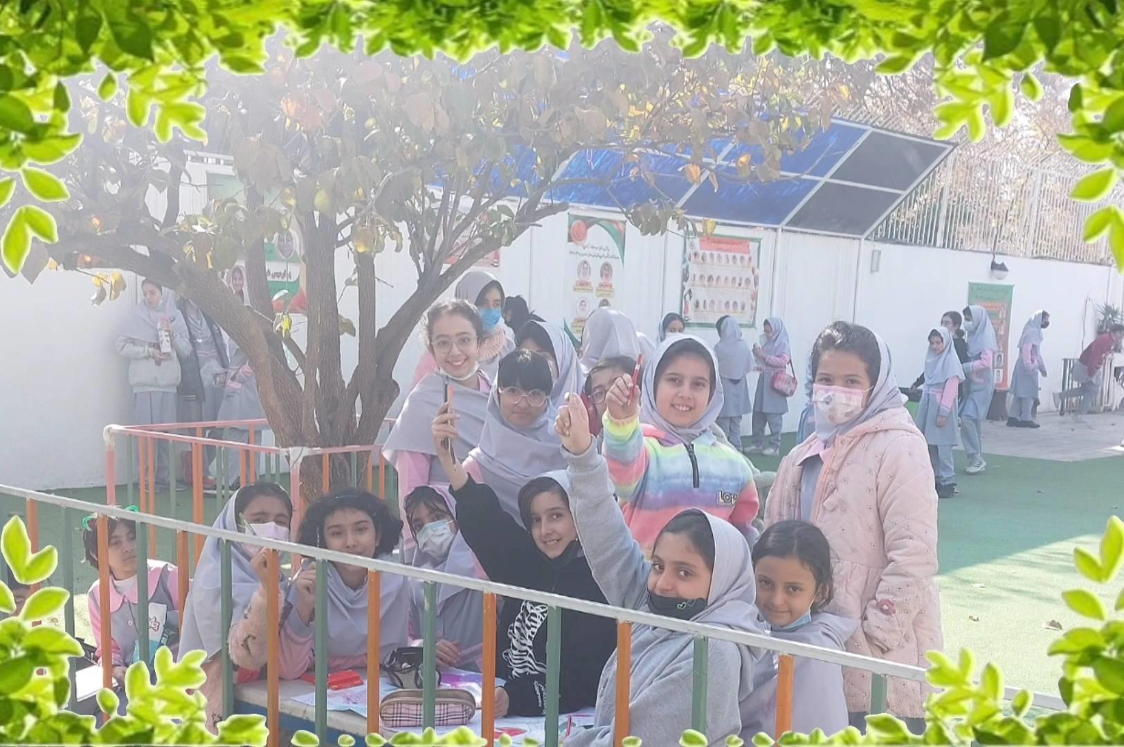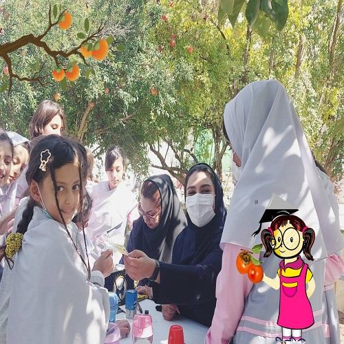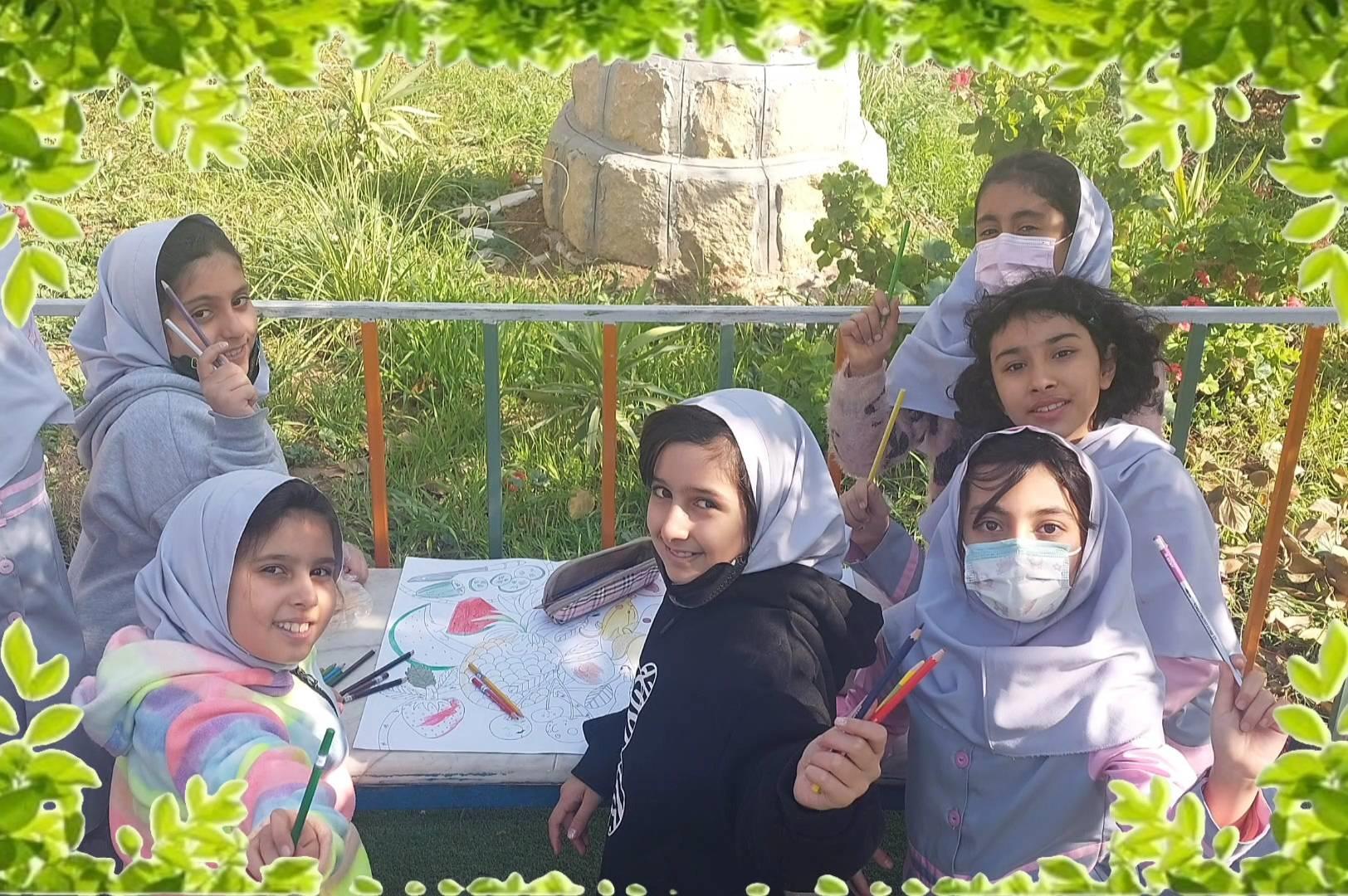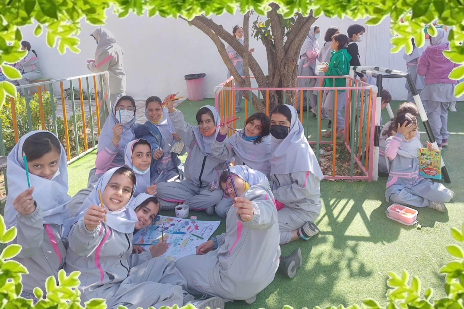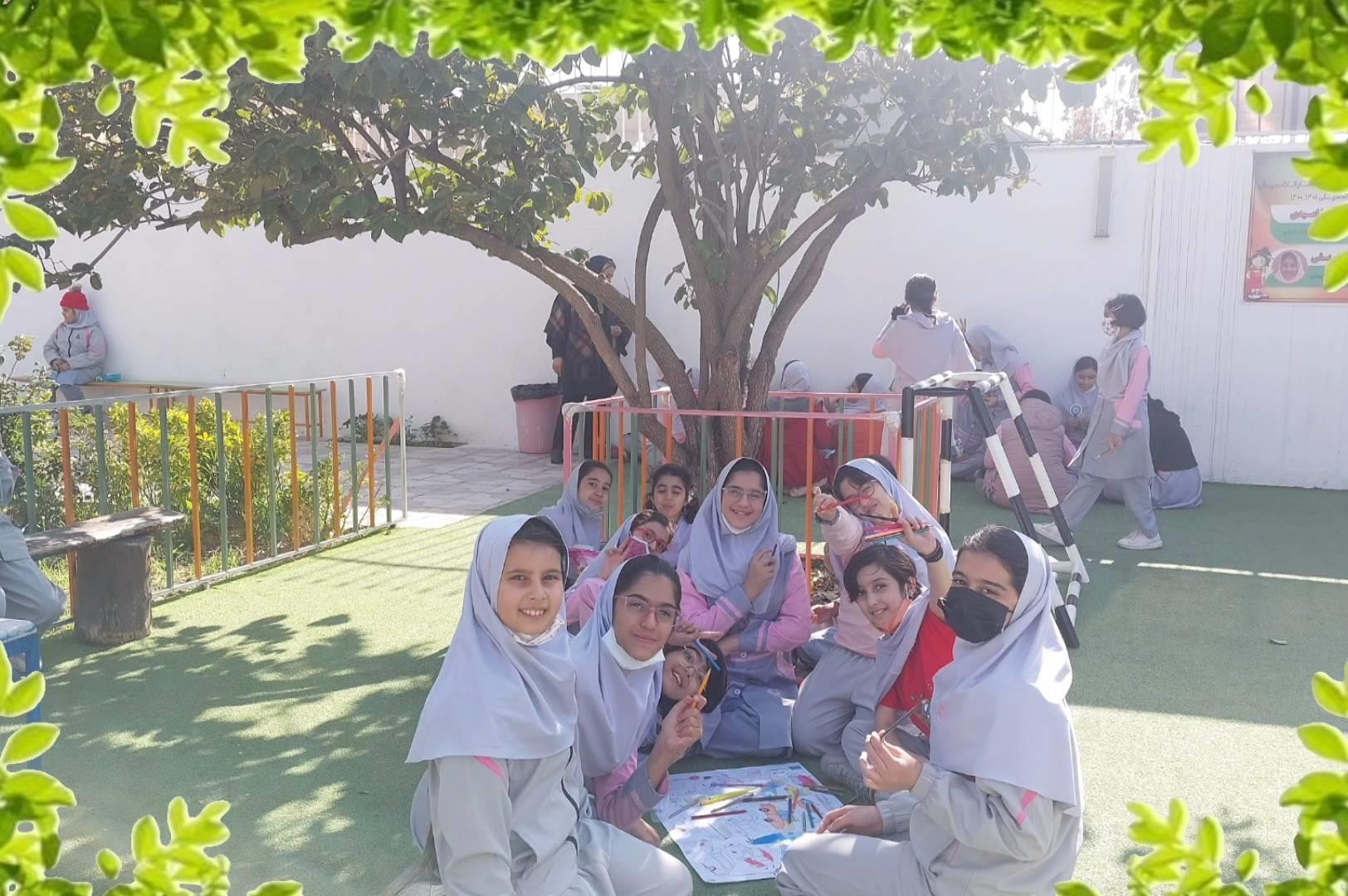 رنگ آمیزی دسته جمعی بچه های رنگر رنگی آبان زیردرخت خرمالو در زنگ تفریح