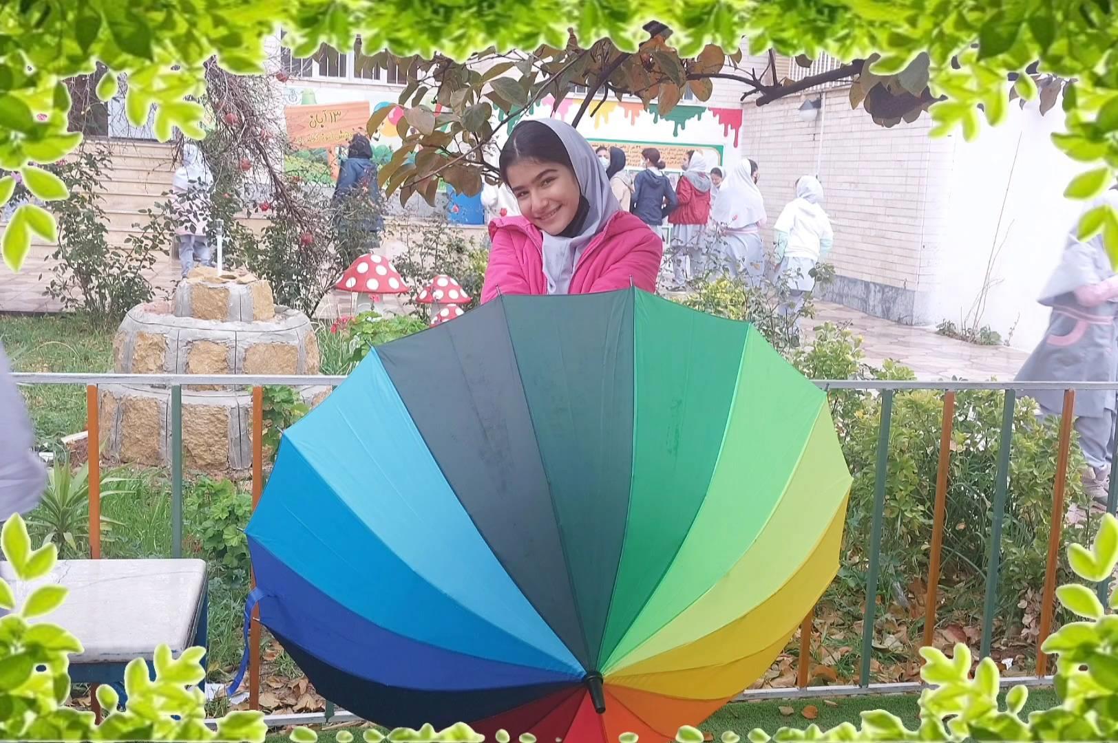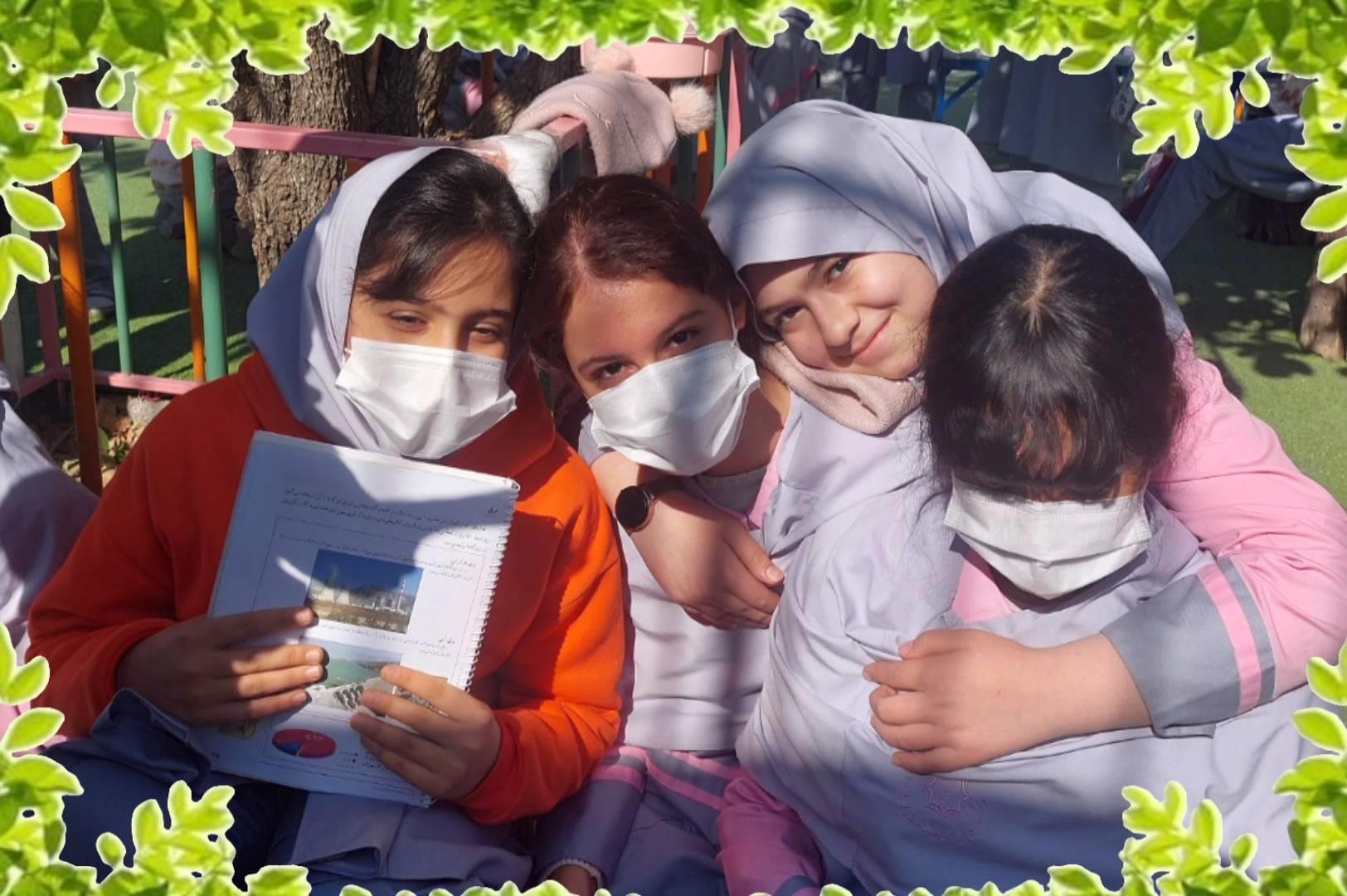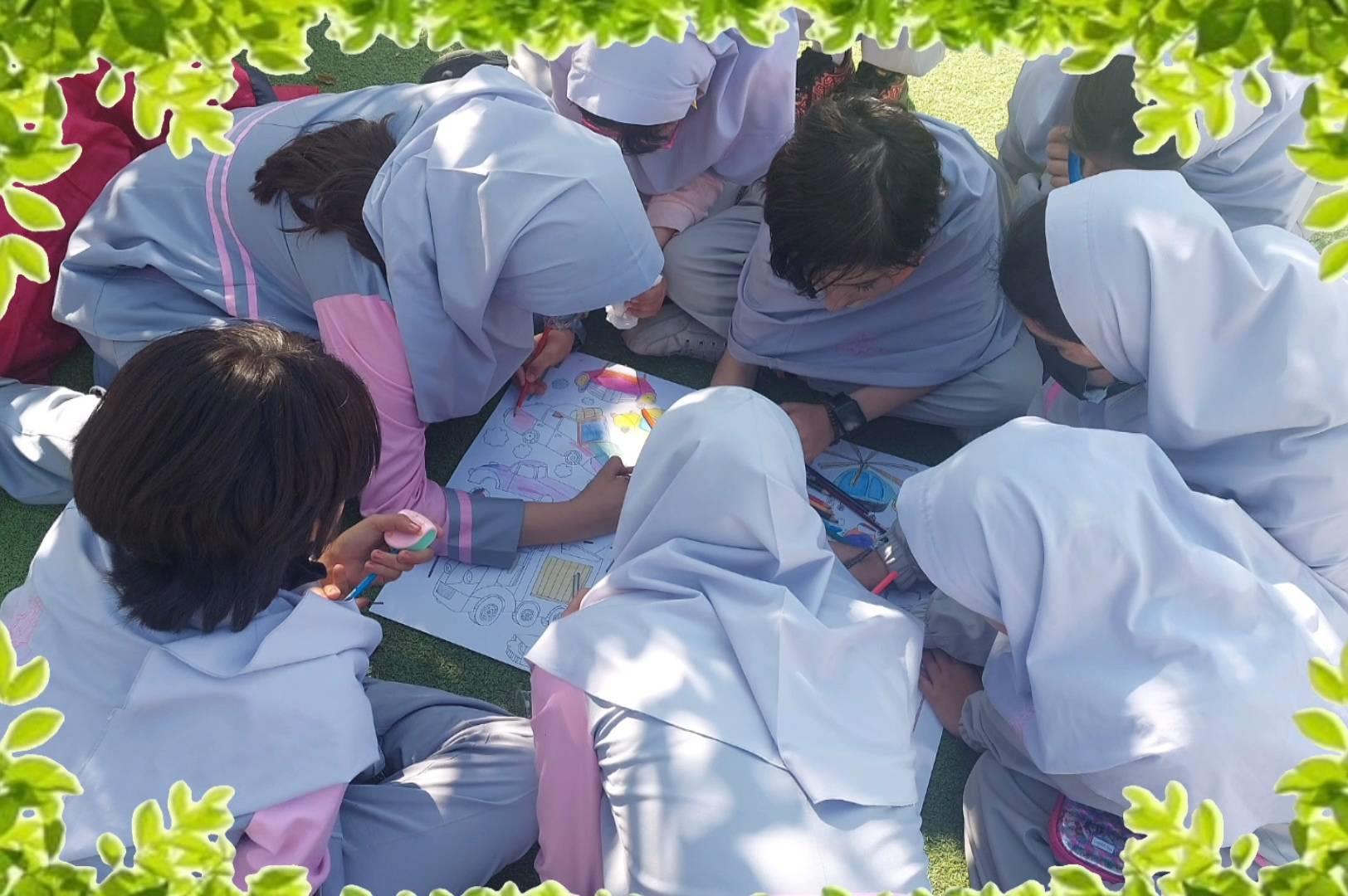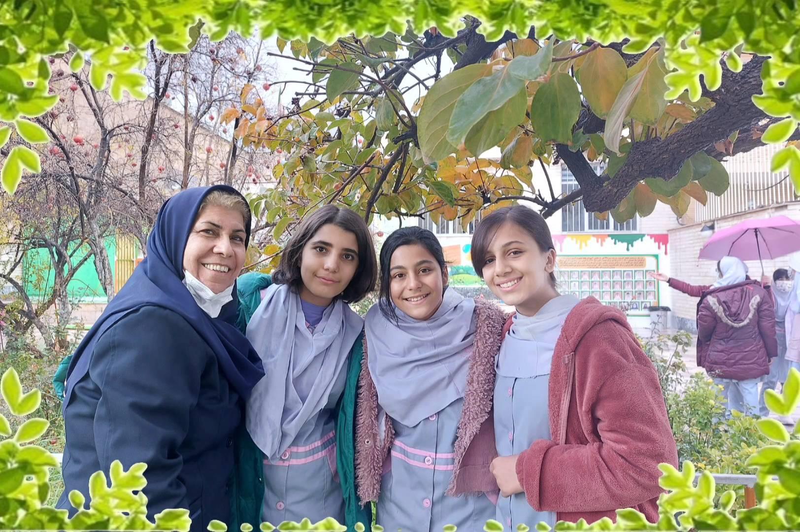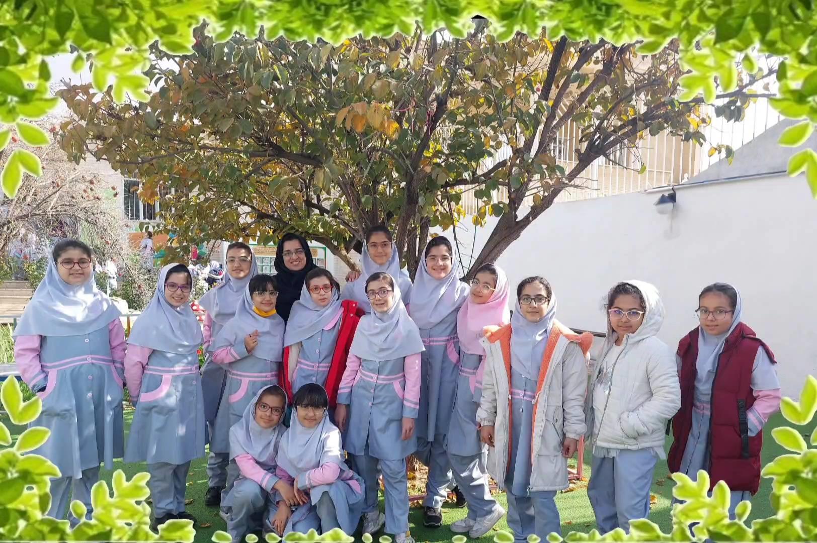 رنگ آمیزی دسته جمعی بچه های رنگر رنگی آبان زیردرخت خرمالو در زنگ تفریح