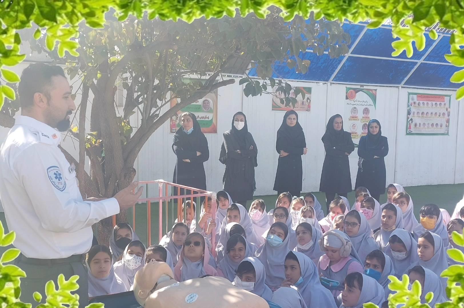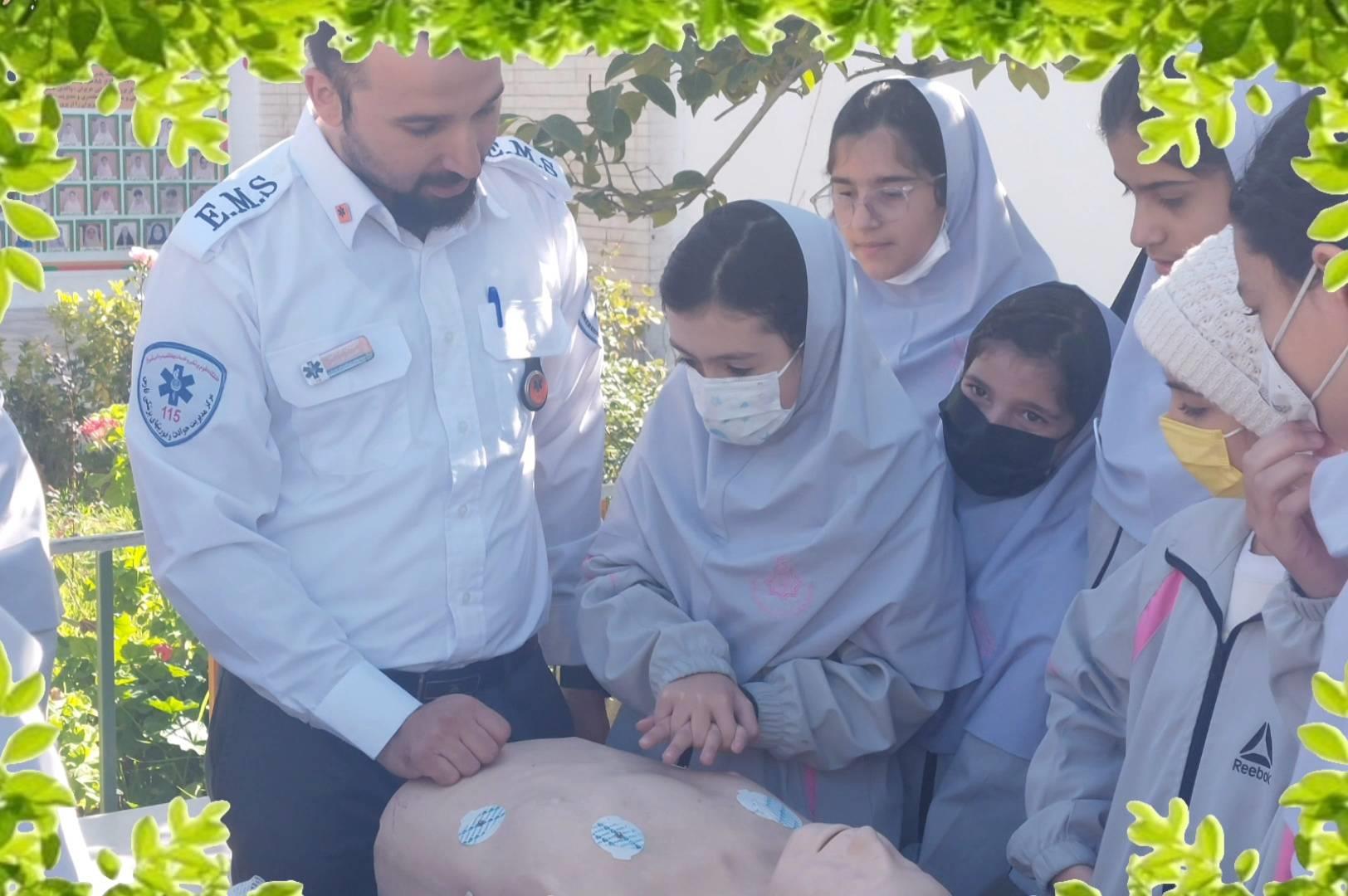 تمرین احیاء قلبی توسط دانش آموزان زیر درخت خرمالو در زنگ تفریح بانظارت کارشناس اورژانس